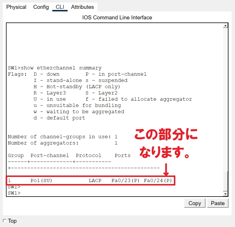 今回の画面では、Po1(SU)LACPFa0/23(P)Fa0/24(P) が表示されていました。